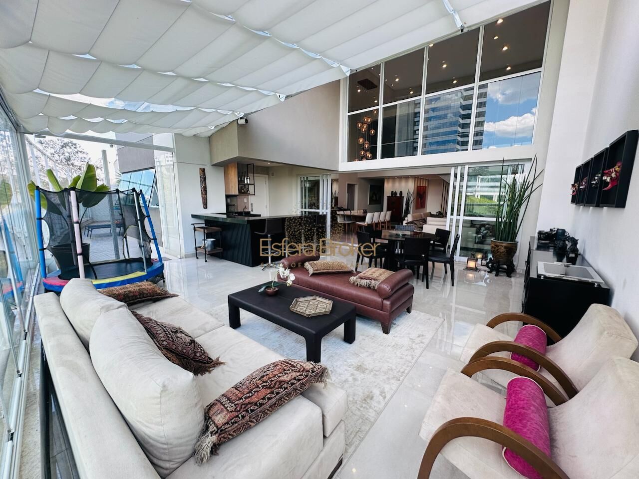 A área social é composta por uma ampla sala integrada, mezanino, escritório, sala de jantar e um espaço gourmet estendido, ideal para momentos de lazer e confraternização.
