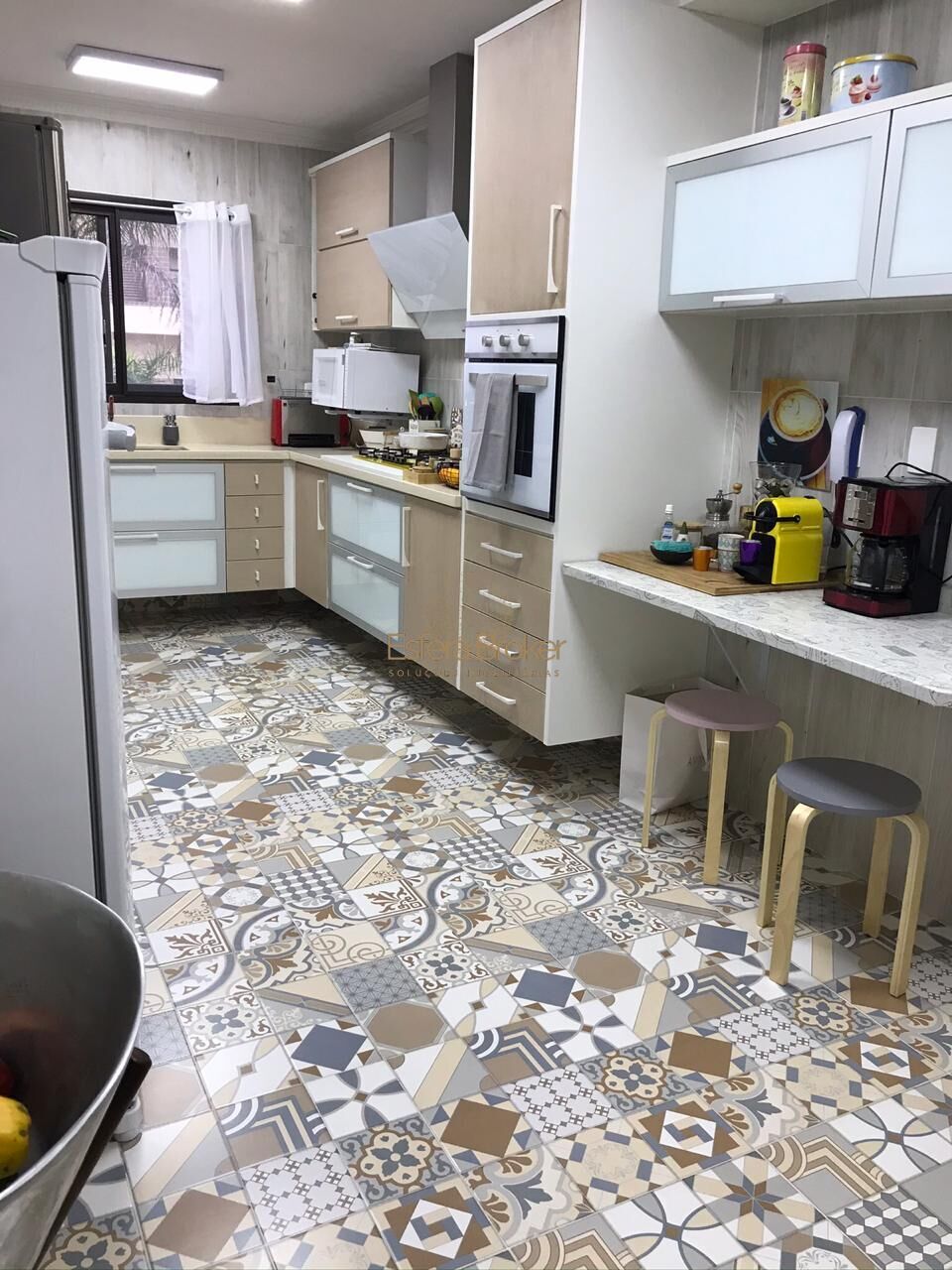 Cozinha com eletros modernos; Corredor de acesso aos quartos com armários; Varanda envidraçada com churrasqueira; Área de serviço com banheiro extra e lavabo decorado