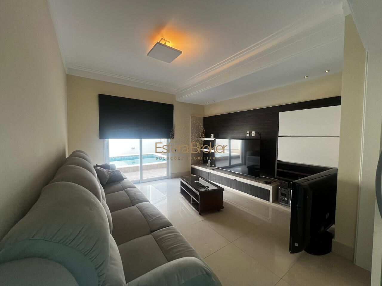 A sala de TV, isolada por porta de correr e repleta de marcenaria refinada, é o cenário ideal para momentos de lazer e relaxamento.