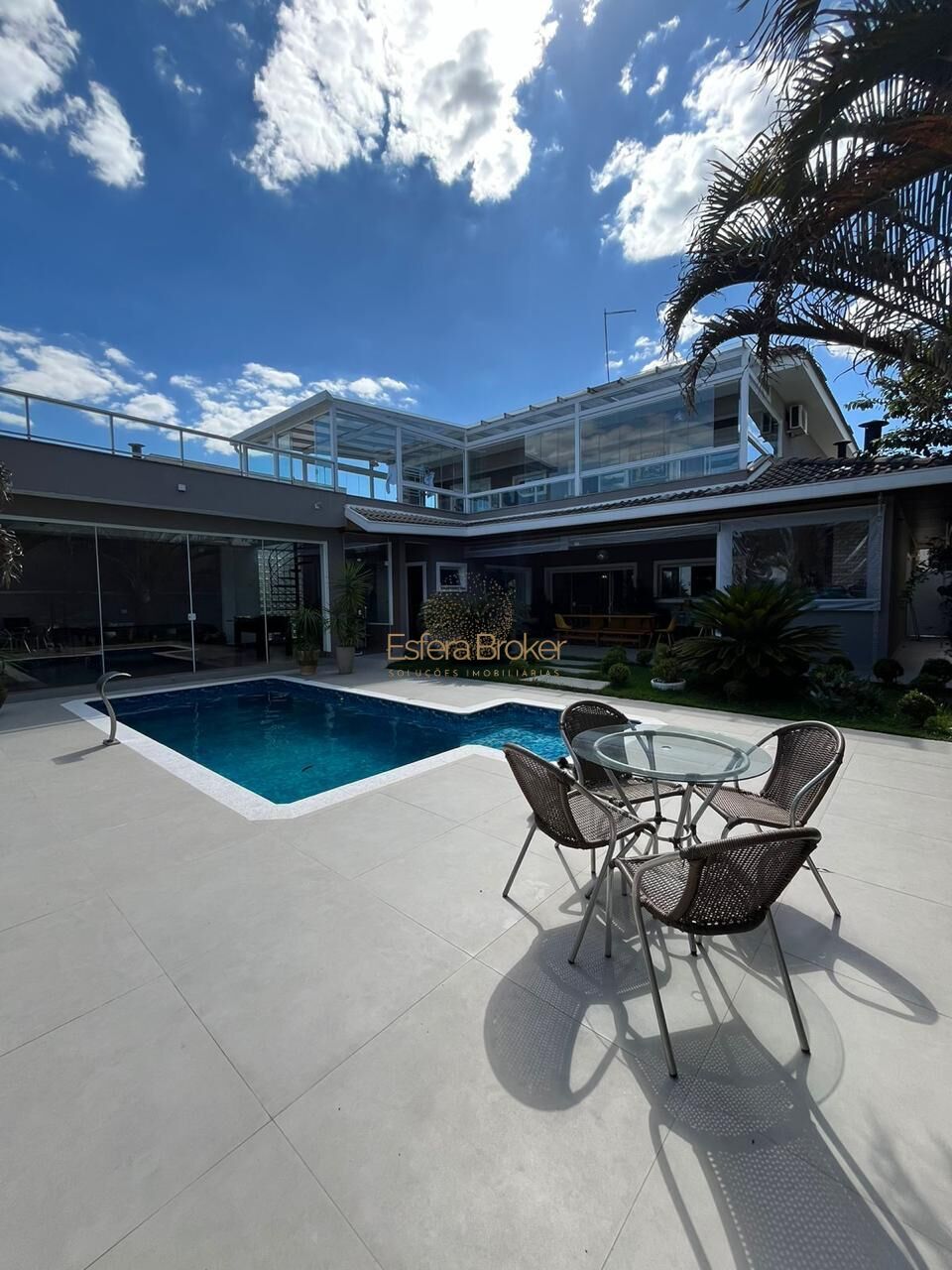 - Varanda toda envidraçada comum a três dos quartos e solário, com acesso interno à sala de jogos;